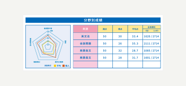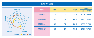 教科別に分野数は異なる為、多角形レーダーチャートを動的に表現し、視覚的に現在の成績や自分の現状分析に役立ちます。